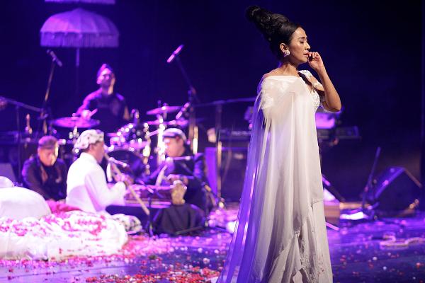 Jakarta, channelsatu.com: Penyanyi asal Bali Ayu Laksmi diiringi grup musik Svara Semesta menyanyikan salah satu tembang dalam pementasan Teater Musikal di GKJ, Jakarta, Sabtu (21/2/2015) malam.